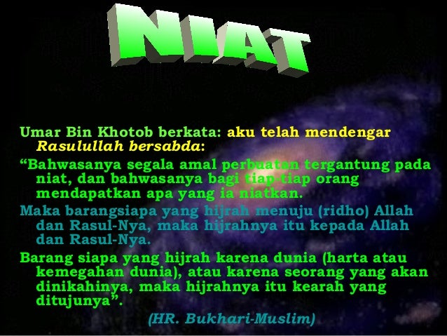 “Barangsiapa yang niatnya adalah untuk menggapai akhirat, maka Allah akan memberikan kecukupan dalam hatinya, Dia akan menyatukan keinginannya yang tercerai berai, dunia pun akan dia peroleh dan tunduk hina padanya. Barangsiapa yang niatnya adalah untuk menggapai dunia, maka Allah akan menjadikan dia tidak pernah merasa cukup, akan mencerai beraikan keinginannya, dunia pun tidak dia peroleh kecuali yang telah ditetapkan baginya.” (HR. Tirmidzi no. 2465. Syaikh Al Albani mengatakan bahwa hadits ini shahih).
